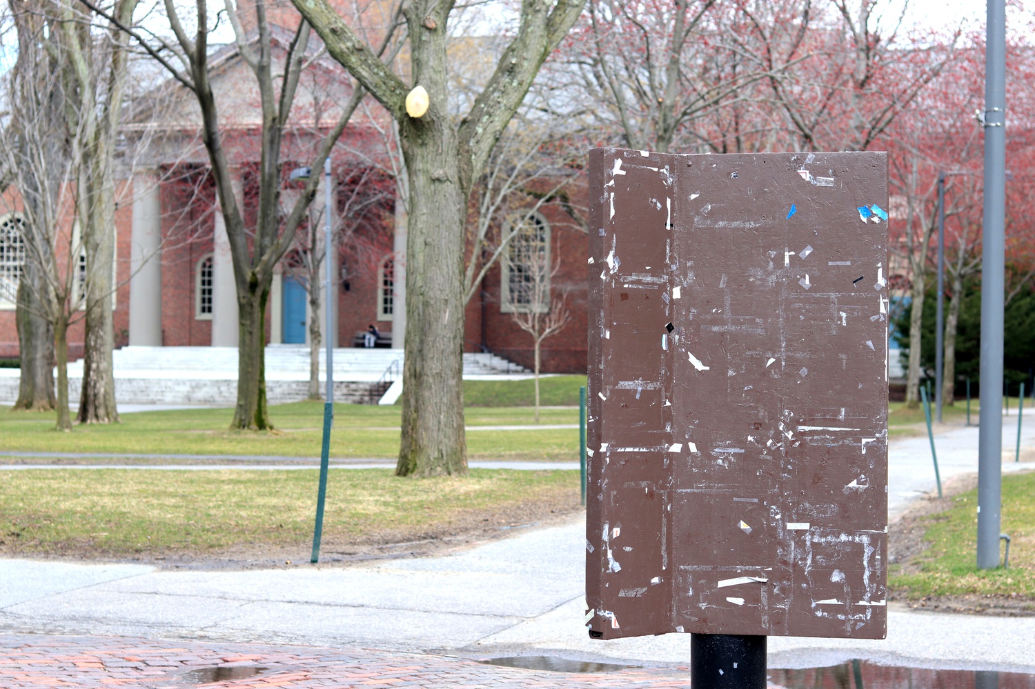 An announcement board typically covered with flyers advertising on-campus events stands barren in Tercentenary Theater.