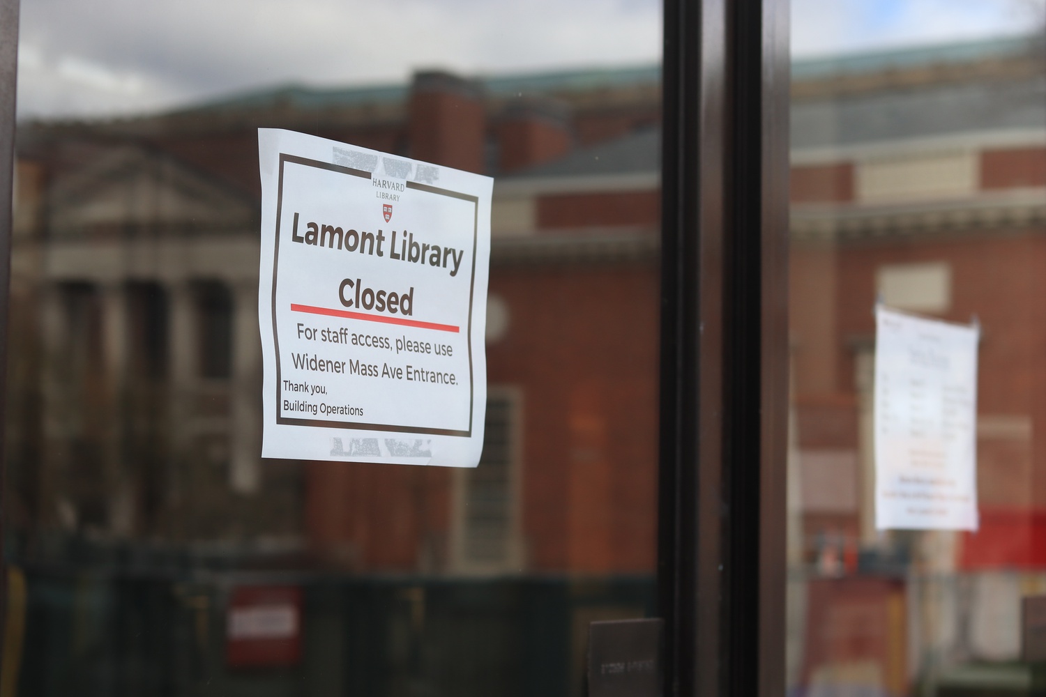 Among the many buildings with closed notices taped to their doors is Lamont Library. The University announced all libraries would close in-print services on March 16.