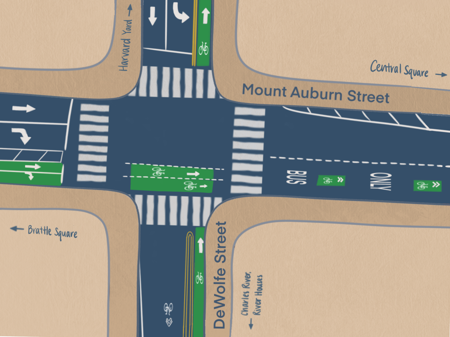The right turn from Mt. Auburn onto DeWolfe Street is particularly difficult for cyclists: it is the only turn in the intersection where cyclists lose their lane and must merge with cars.