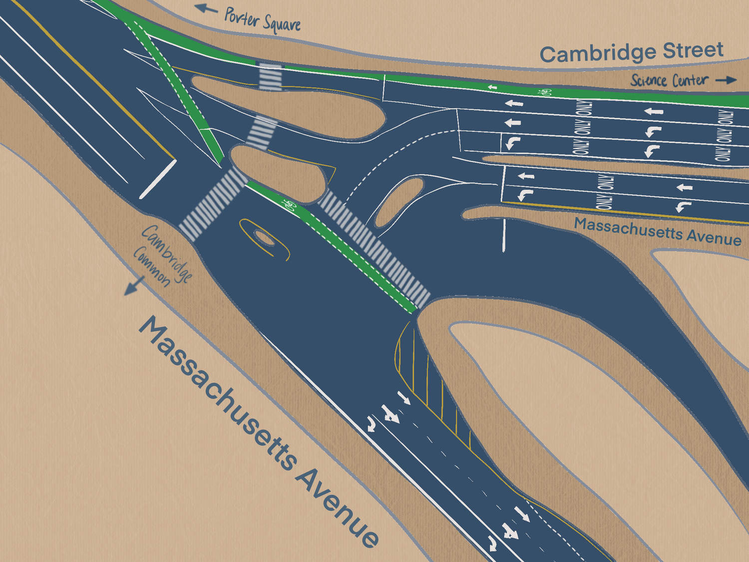 Cyclists are forced to make the best of a bad situation: those crossing Mass Ave. toward the Common must share the pedestrian crosswalk — which goes through two separate traffic islands. Those heading up Mass Ave. toward Porter Square must cross five disconnected car lanes with two bike signals, one of which requires them to stop between two lanes of traffic.