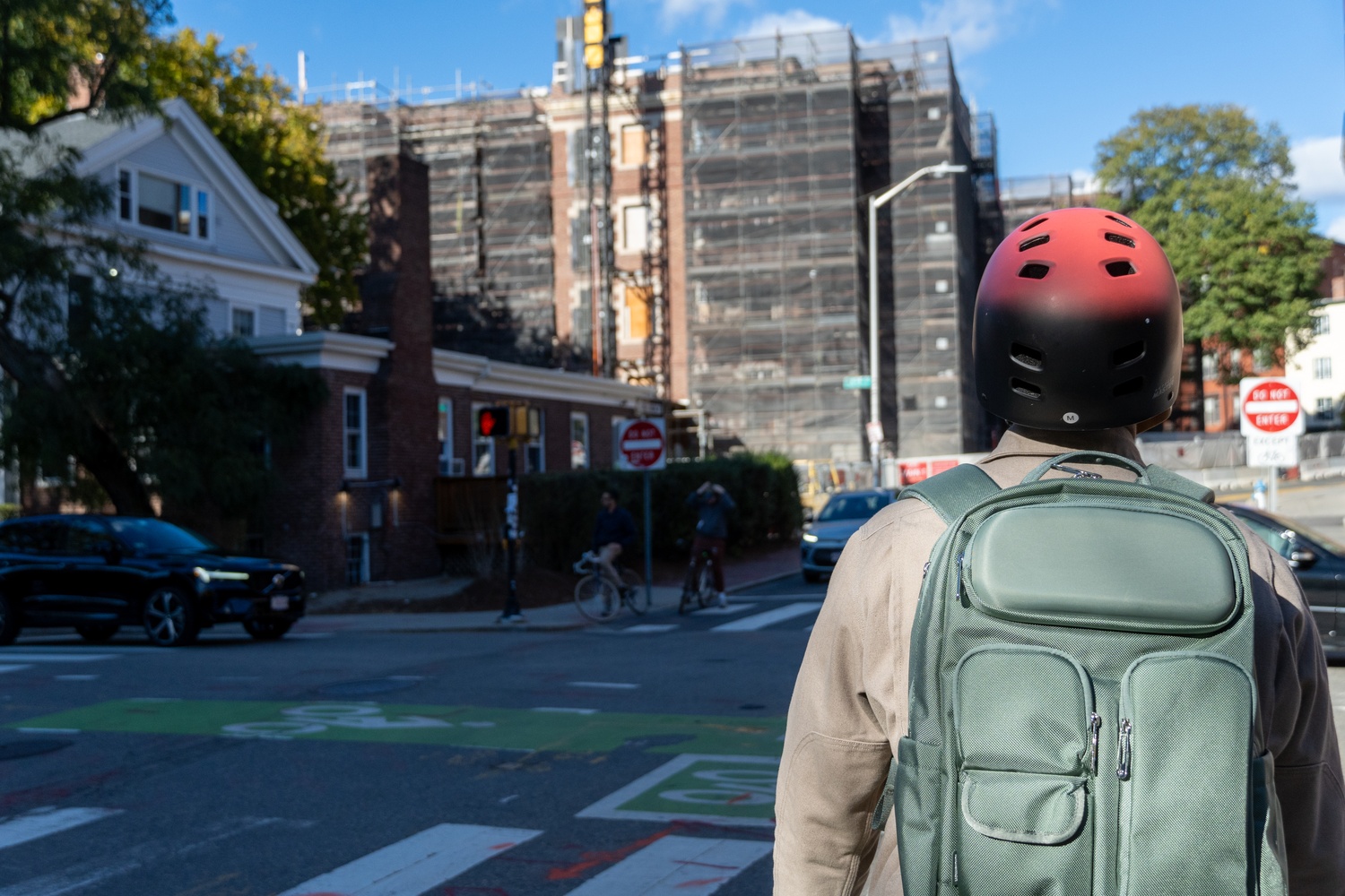Above, a cyclist waits in their lane to cross Mt. Auburn Street and go up DeWolfe Street toward the Yard. While cyclists going up DeWolfe Street have a separated lane, cyclists going in the opposite direction must share the lane with cars and buses.