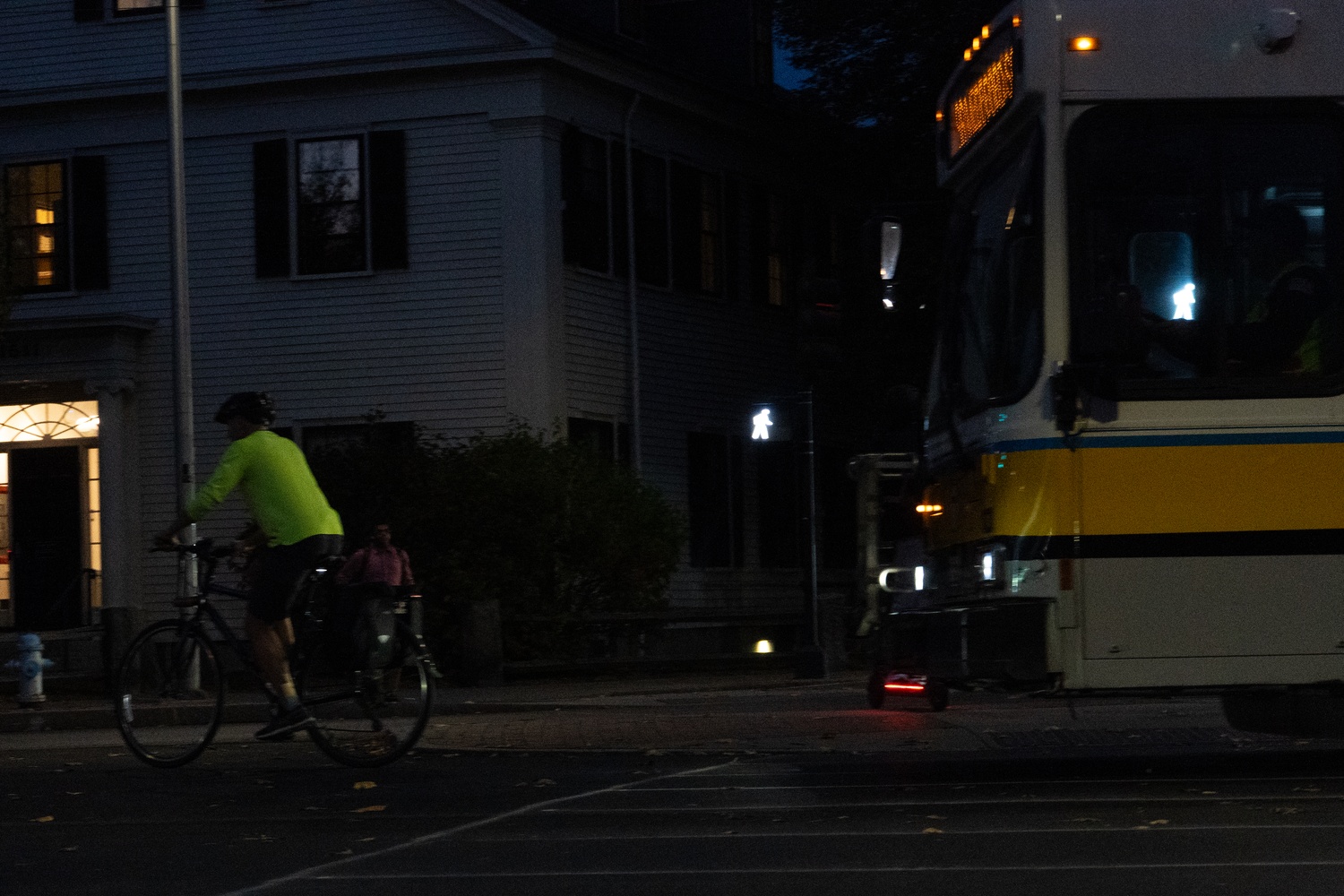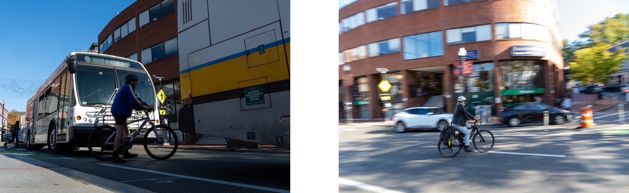 Above, an MBTA bus honks at a waiting cyclist for blocking traffic before pulling forward and going around the cyclist.