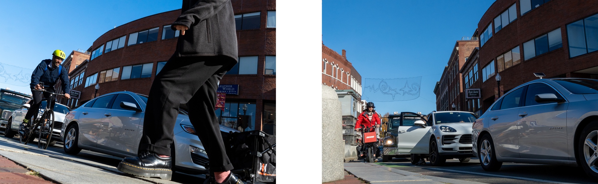 Even when the cyclists don’t have to cross the intersection, they face another obstacle: obstructions in their designated lane. The above incidents happened within 15 minutes of each other. In the first, a person with a wagon crosses the intersection outside the crosswalk, cutting off a cyclist. In the second image, a car in traffic opens its door, forcing the cyclist to swerve to avoid it.