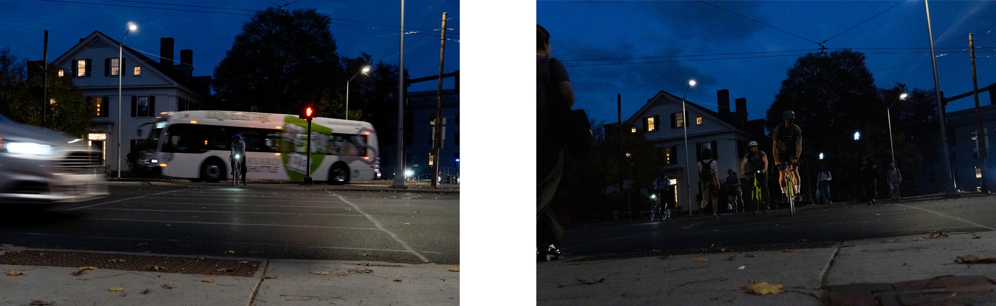 As the sky gets dark, some cars begin slowing down before they reach crosswalks, and cyclists can be seen checking for oncoming traffic before crossing, even when they have the light. At an intersection with such a complicated design, drivers, pedestrians, and cyclists adjust their behavior to keep each other safe.