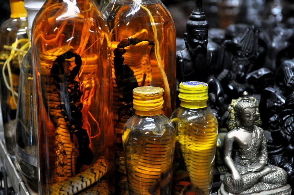- At one booth of the Russian Market, the owner sells two types of goods: religious statues and snake potions. Most of the religious sculptures depict Buddha, usually created with either a metal or wood material (painted black). The snake potions are bought usually by men who want to strengthen their sexual functions. By Sharon Kim