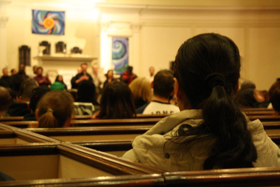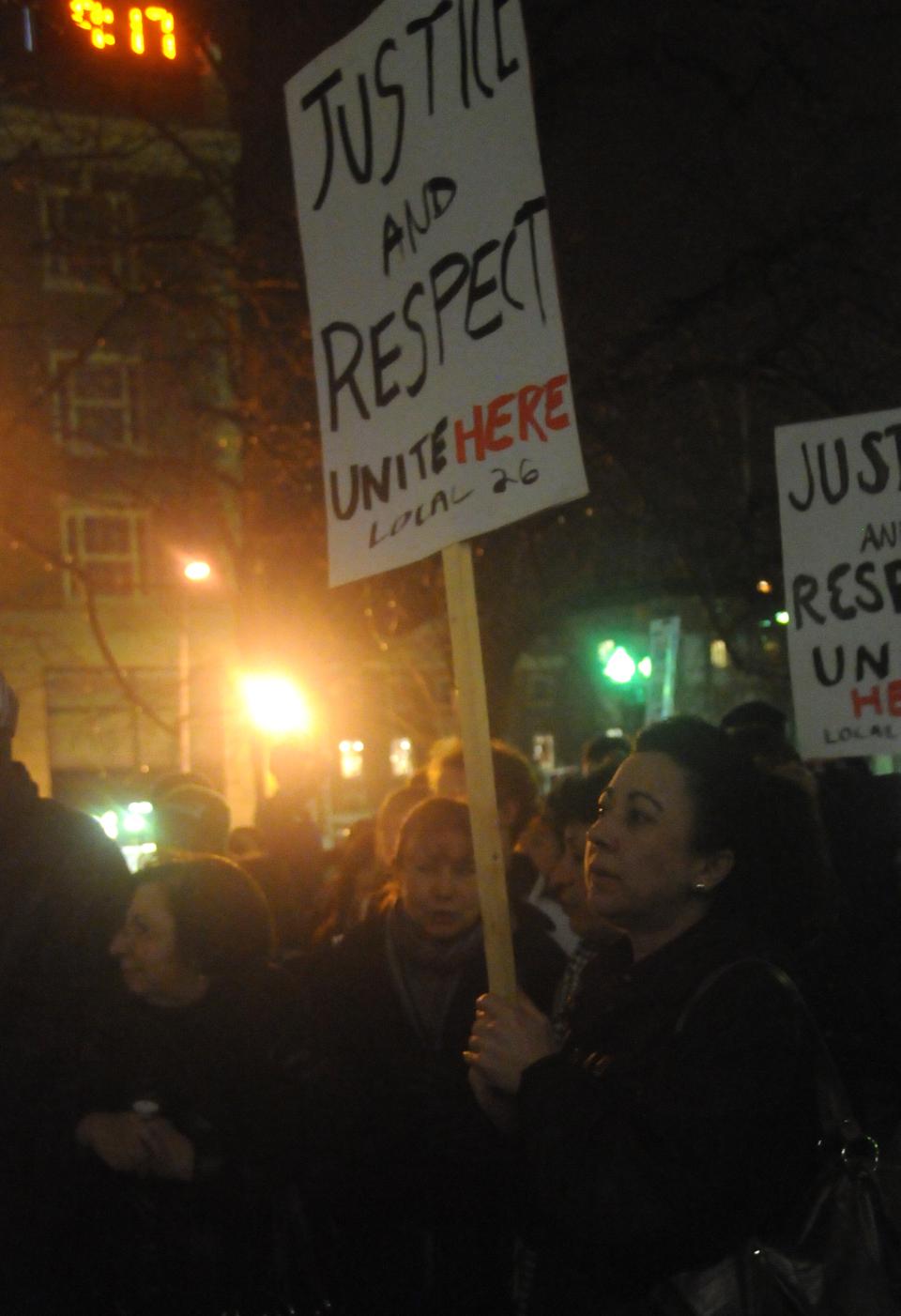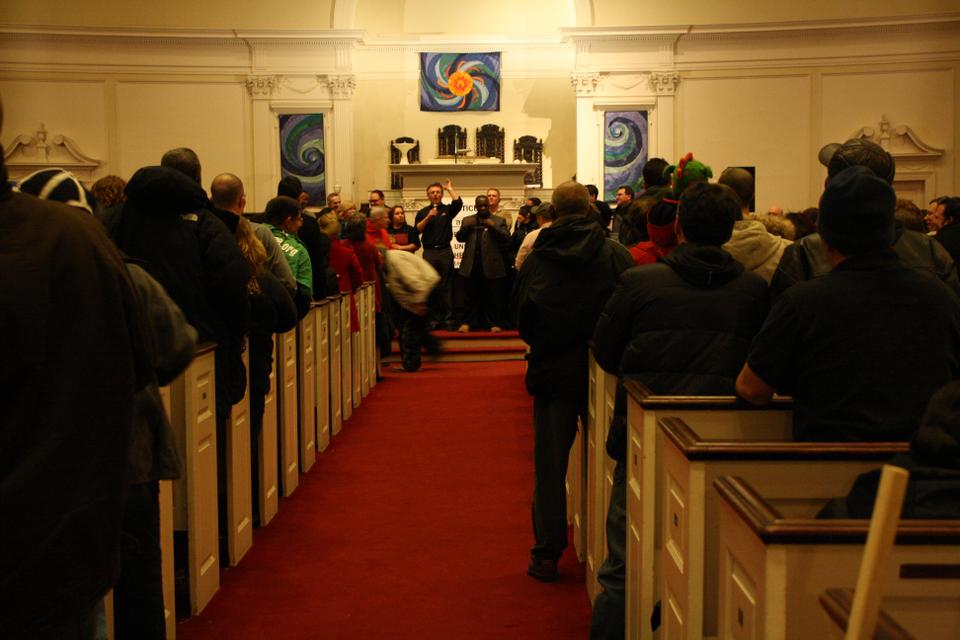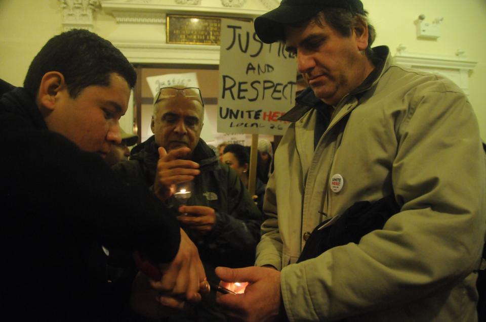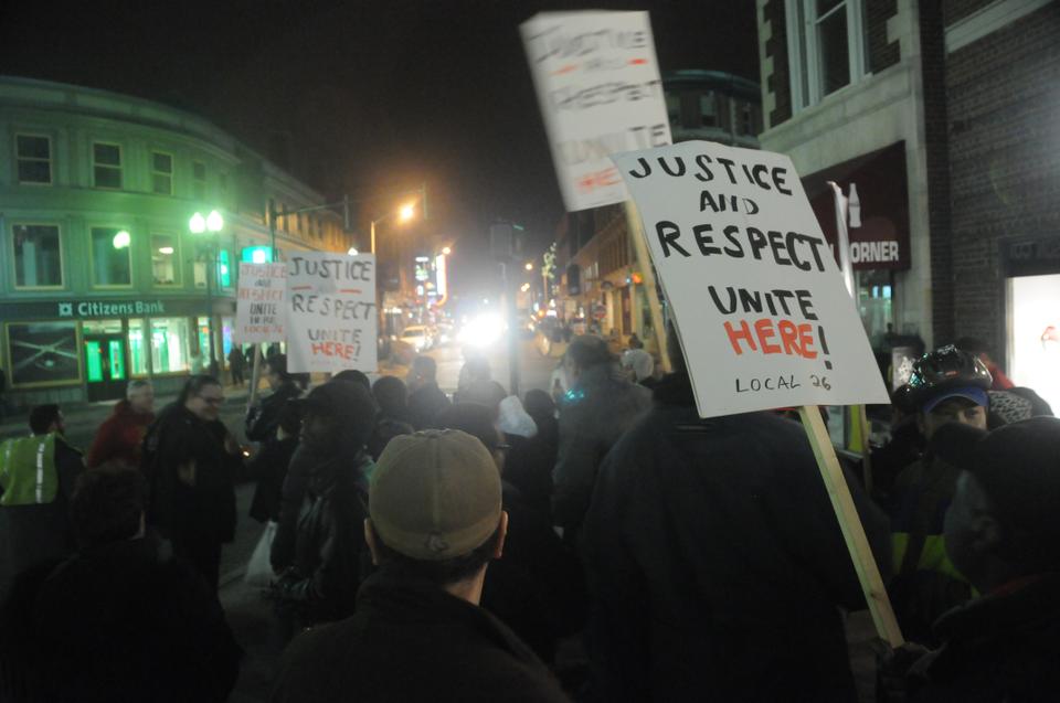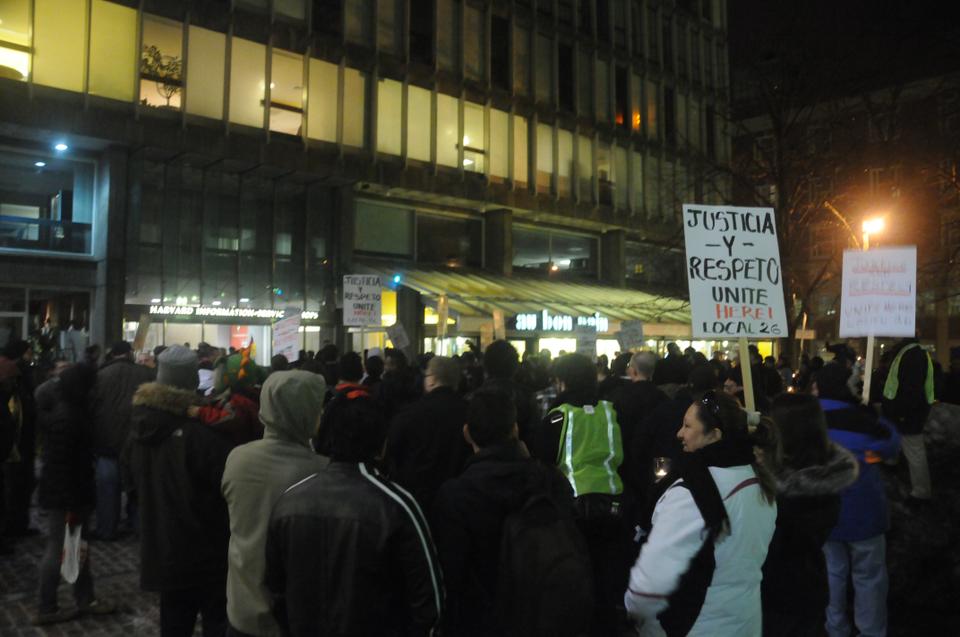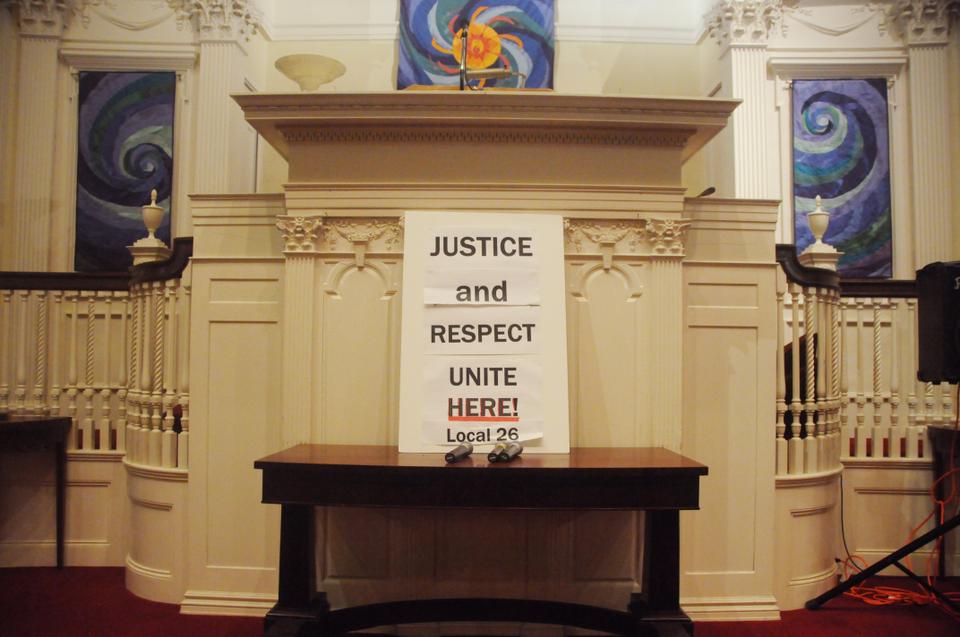 Harvard dining hall workers, Local 26 union representatives, and the Student Labor Action Movement came together at First Parish Church in Cambridge to rally in support of Harvard's dining hall staff.