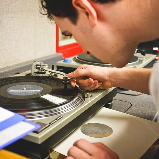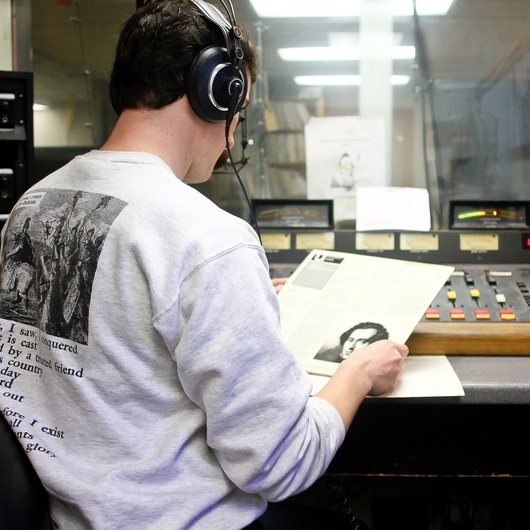 Two microphones flank WHRB’s multicolored switchboard. Five red zeros cross its screen and a pair of headphones lies next to a half-filled coffee cup. At 1 p.m., Elliot A. Wilson slips the headphones over his ears, flips a switch, and takes one last sip of coffee.